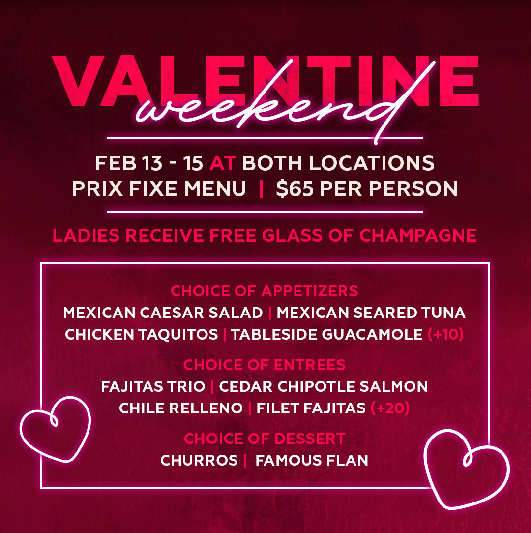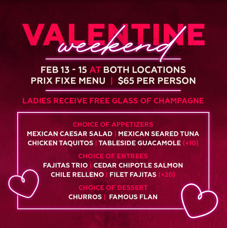 - Feb 13–15 • Both Locations — enjoy a $65 prix fixe menu with choice of appetizer, entrée, and dessert, plus ladies receive a free glass of champagne.